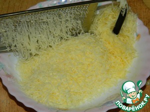 Натереть яйца на мелкой терке. Добавить мелко нарезанный лук и мягкое масло.