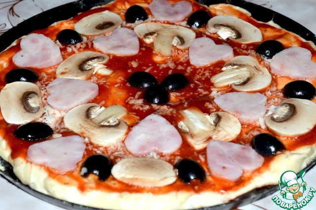 С помощью этой пиццы из бесподобного Неаполитанского теста от Питера Рейнхарта я хочу сказать "Люблю" своей семье, которая ее просто обожает. Тесто у пиццы потрясающее, нежное и с "пузырьками " как у всей хорошей итальянской выпечки. С некоторых пор пицца стала для нас особенным блюдом. Так случилось, что в тринадцатую годовщину нашей свадьбы мы попали в Ниццу. Так вот, вдоволь нагулявшись по Английской набережной и Цветочному рынку, мы набрели на небольшую и уютную пиццерию. Там мы заказали пиццу, решив таким образом отметить годовщину, пицца оказалась такой огромной, что еле-еле поместилась на нашем столике. Ее вкус был просто потрясающим, ничего подобного до этого момента мы не пробовали. Мы часто вспоминаем ту годовщину особенно, когда печем пиццу, это было невероятное приключение хоть и с цифрой 13.