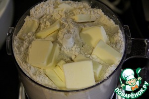 Готовим тесто. В кухонный комбайн помещаем муку и масло, порезанное на тонкие куски и перемешиваем.