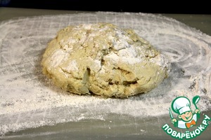 Утром вынимаем тесто и кладем на стол, присыпанный мукой. Посыпаем сверху немного муки
