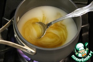 Тем временем готовим начинку. Помещаем в кастрюлю сахар, мед и воду и доводим до кипения.
