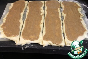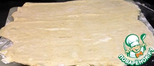 Достаем из холодильника остывшее тесто и раскатываем прямоугольник примерно 40 х 45 см.