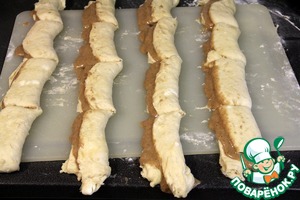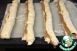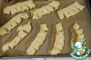 Скалкой слегка раскатать каждую трубочку и разрезать на 3 - 4 части