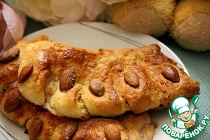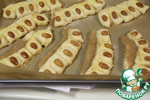 После того как тесто чуть поднялось, смазываем яйцом, кладем миндальный орех на каждый пальчик и посыпаем сверху сахаром.