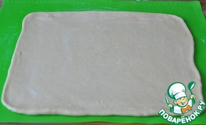Раскатываем тесто в прямоугольный пласт, толщиной около 1 см. В моём случае пласт 30 на 40 см. Смазываем растопленным сливочным маслом.