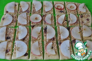 Режем тесто на прямоугольники, ориентируйтесь по форме, в которой будете выпекать, в моём случаем 5 на 7 см. Сверху каждого кусочка теста кладём пластинку яблока.