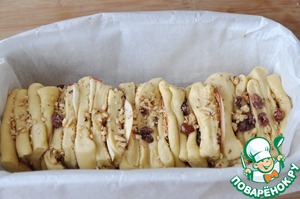 Последовательно кладём в форму все прямоугольнички теста с яблоками. Кладите неплотно, тесто ещё поднимется. У меня тесто подошло так хорошо, что некоторые кусочки сильно вылезли при выпечке. Последний кусочек положите "чистой" стороной к стенке. Накрываем форму полотенцем и даём подняться 20 минут.