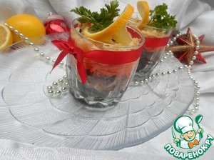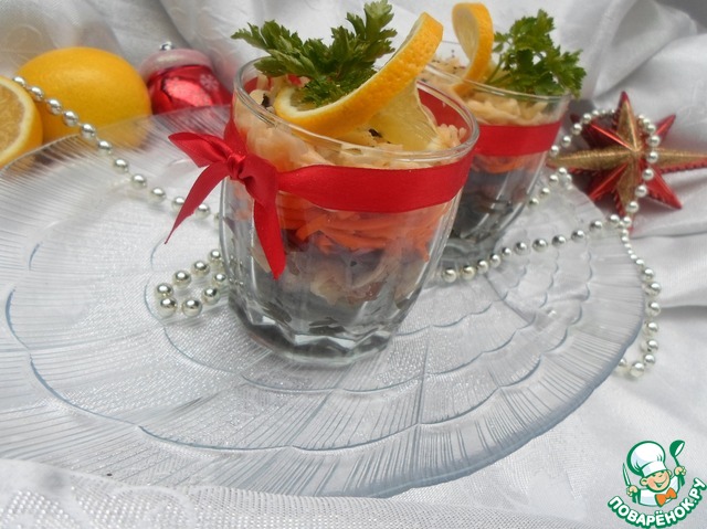 Собираем салат: 1 слой-капуста,2 слой-сельдь,3 слой-лук (нарезанный полукольцами),4 слой-морковь,5 слой-сыр.