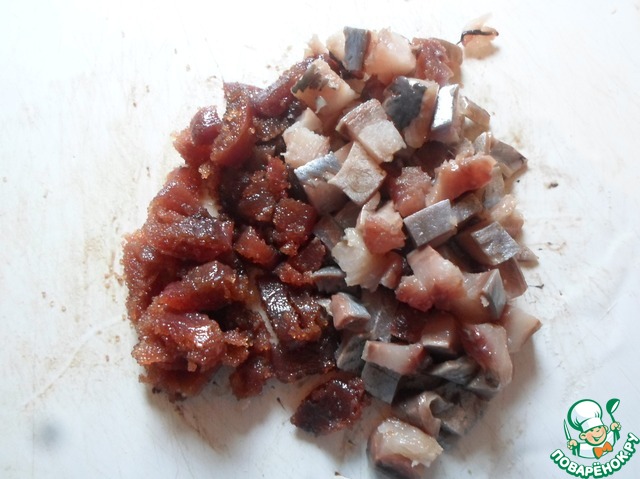 Сельдь порезать кубиком.