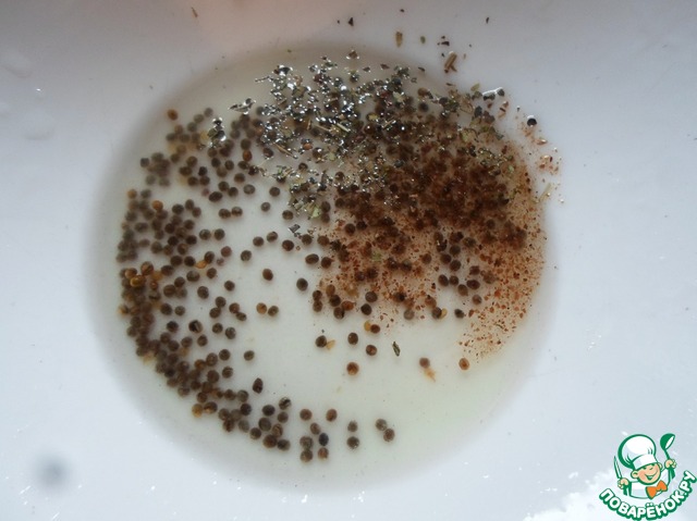 Делаем заправку. Масло смешиваем с семенами горчицы, мускатным орехом и базиликом.