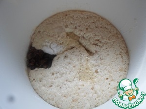 В готовую опару вводим соль, изюм (предварительно замеченный в кипятке), банан (протертый на мелкой терке), ванилин, масло.