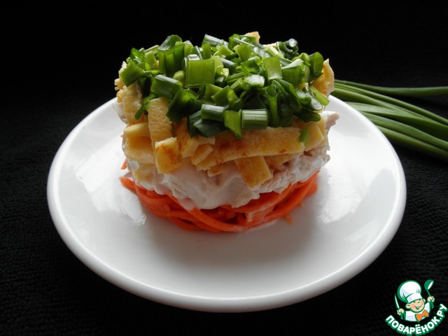 Вкусный, сочный и пикантный салатик с куриным мясом и корейской морковкой. Наверняка понравится сильной половине, хотя и женщинам очень уж он по душе, за счет нежнейших блинов на сливках, входящих в состав салата. Угощайтесь!!!