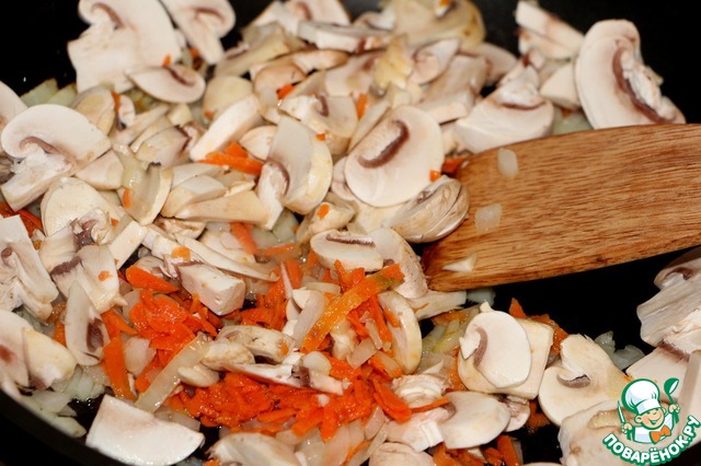 Добавить морковь и грибы, готовить, помешивая, на сильном огне, не зажаривая (жидкость должна полностью испариться).