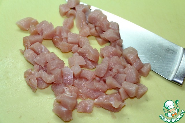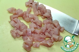 Соединить в чаше блендера 150г филе куриной грудки и грибы с луком. Измельчить смесь до однородного состояния.