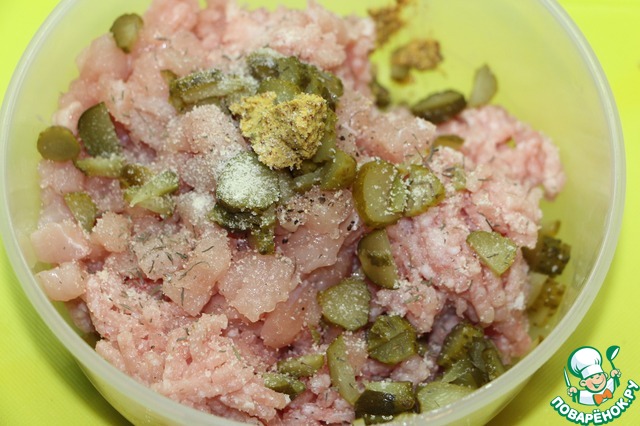 К фаршу добавить кубики курицы, зернистую горчицу и порезанные произвольно корнишоны. Перемешать.