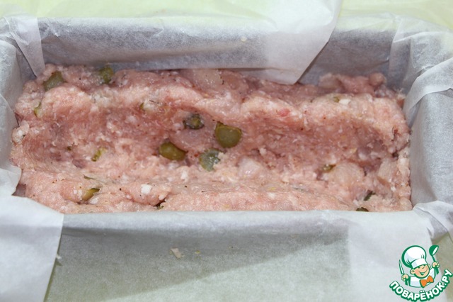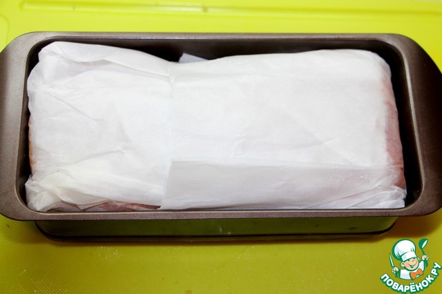 Форму для паштета выстелить бумагой для выпечки, оставив по бокам напуск.
