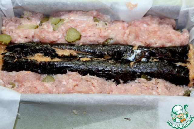 Выложить рулет поверх фарша, слегка его утопив, черенком ложки "помять" бока рулета, чтобы потом на срезе начинка была неровной.