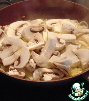 Грибы, лук почистить, порезать удобным вам способом. Обжарить на сковороде в 2 ст. л масла. -