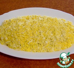 • Яйца трем на терке, отложить пару ложек для украшения, остальные укладываем сверху картофеля. Полить соусом.