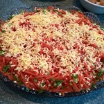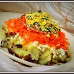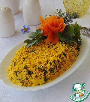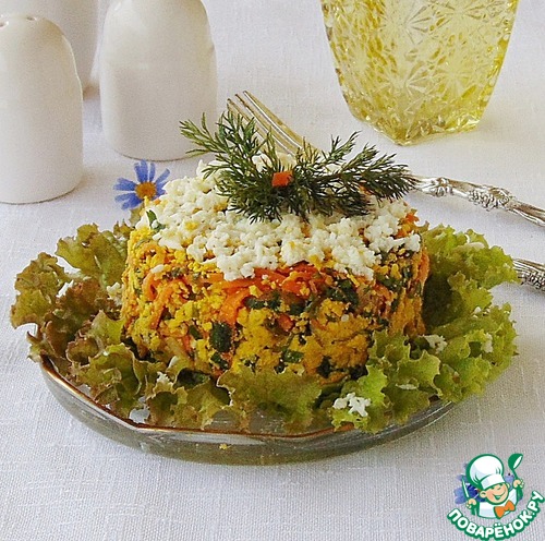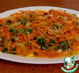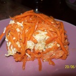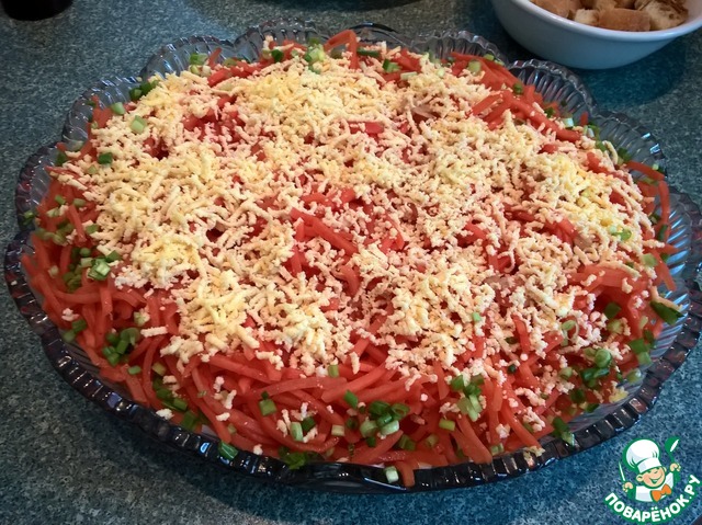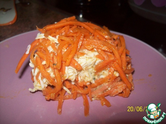 Сверху укладываем морковь-по корейски (обычно я ее готовлю с вечера, чтобы она хорошо замариновалась.)