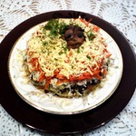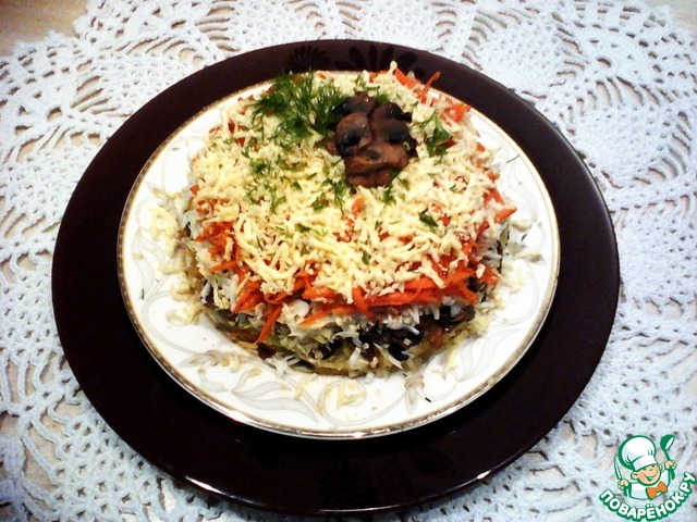 Сытный, пикантный салат с маринованной по-корейски морковкой и грибами. Исчезает с тарелок мгновенно. Рекомендую!
