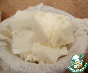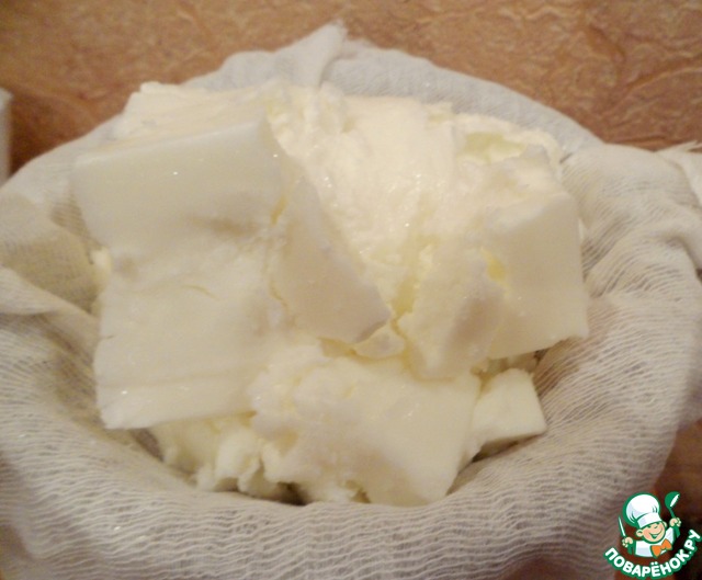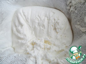 Готовый творожный крем-сыр выложить из марли. У меня получилось 400г.