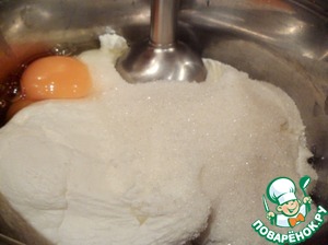 Добавить туда протертый через сито жирный творог, яйца, 1ст. сахара (можно добавить больше по вкусу), перемешать погружным блендером, венчиками взбивать нельзя, чтобы не насытить массу кислородом, от которой при выпечке масса может потрескаться.