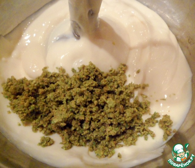 Отложить 1/3 массы, добавить в нее измельченные фисташки.