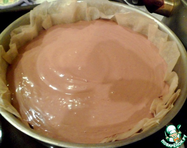 Шоколадную массу выложить поверх фисташковой. Форму поставить в емкость с водой (если форма разъемная, ее изолировать фольгой от воды), выпекать 45-60 минут при температуре 160 градусов, середина должна остаться чуть дрожащей. Выключить духовку, приоткрыть и оставит доходить минут 40. Достать, остудить, из формы не вынимать, поставить в холодильник для стабилизации на 6 часов.