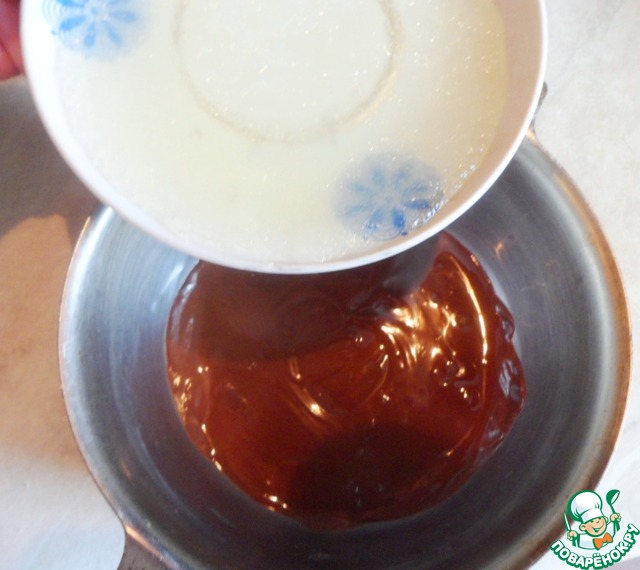 Делаем шоколадную глазурь: желатин замочить в сыворотке на 10 минут. В это время шоколад растопить на водяной бане, смешать с желатиновой массой, если желатин не растворился, прогреть массу на водяной бане до растворения желатина.