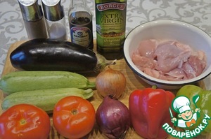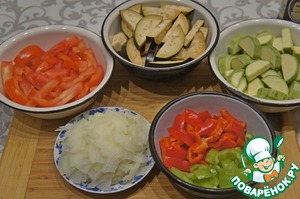 Кабачки и баклажаны нарезать крупными брусочками или полукольцами, перец - широкими полосками, лук измельчить произвольно.