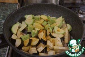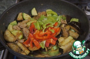 Затем всыпать баклажаны и кабачки, перемешать, влить соевый соус и готовить еще 2 минуты.