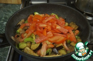 Затем помидоры. Посолить и поперчить по вкусу, перемешать. Готовить еще 5 минут.