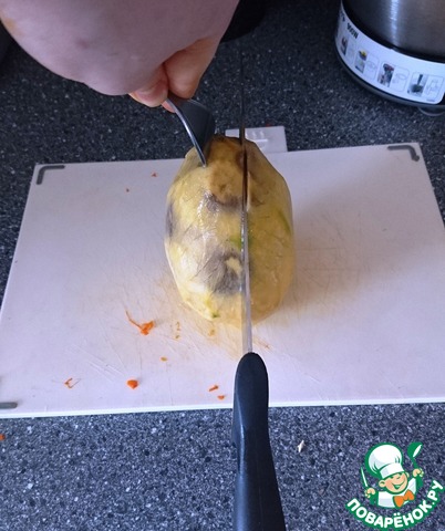 Я отделяю от косточки так, одну часть прокалываю вилкой, и так держу, пока отрезаю мякоть от косточки.