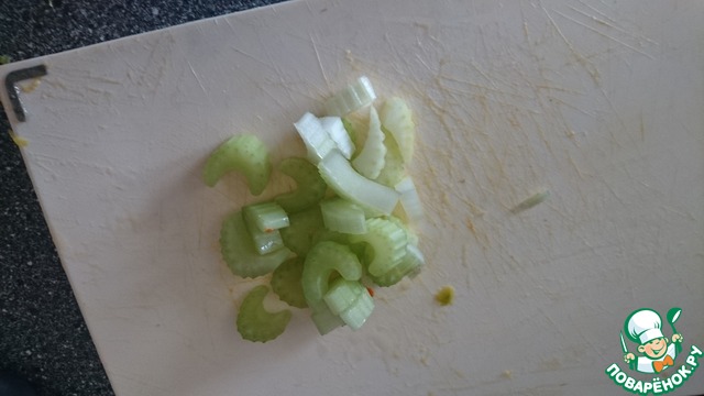 Нарезать чеснок, не очень мелко и сельдерей. Отправить к остальным овощам.