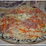 Основной принцип приготовления этого салата - стараемся все ингредиенты нарезать "соломкой". И от каждого подготовленного таким образом ингредиента не забываем отложить небольшую часть, которую используем в последствии для украшения салата.