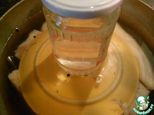 • Ставим на плиту и варим после закипания 10 минут. Выключаем плиту. Потом убираем банку и накрываем казан (кастрюлю) крышкой и оставляем на 12 часов в этом рассоле. Через 12 часов вынимаем сало и промокнув его салфетками заворачиваем в пищевую пленку и отправляем в морозильную камеру. Еще пару часов терпения и все готово. Режем черный хлебушек, сверху кусочек сала и наслаждаемся приятным вкусом. Тем более зная что в этом продукте нет никакой химии которая присутствует в сале которое продается в магазинах. Приятного аппетита. Спасибо