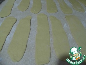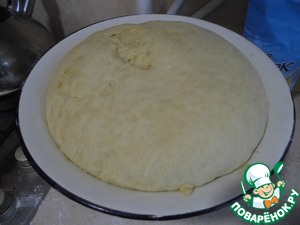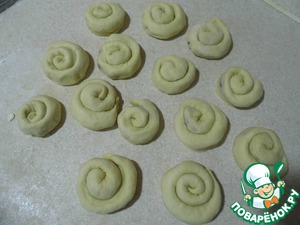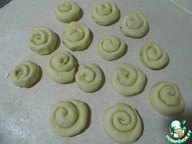 Тесто через час обмять и оставить подыматься еще на 30 минут. Затем тесто раскатать в качалку и поделить на произвольное количество частей в зависимости от Вашей формы. У меня получилось 14 частей.