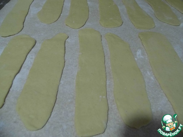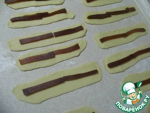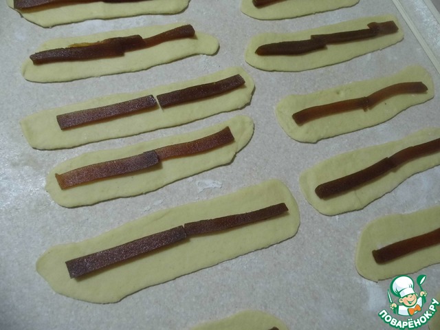 На раскатанное тесто выкладываем повидло нарезанное на пластинки.