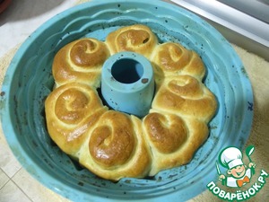Берем обычную форму для кекса и смазываем ее и выкладываем первый слой цветочком вниз плотно прижимая их друг к другу. Взбиваем яйцо с 30 мл. молока и смазываем первый шар. Затем цветком вверх выкладываем второй слой и также смазываем яично-молочной смесью.