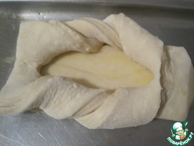 На противень кладем кусочек теста (я положила раскатанный обрезок слоеного теста с краев)