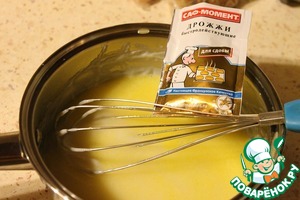 Сначала нужно приготовить стартер. Для этого смешать муку и молоко, чтобы не было комочков. Затем поставить на медленный огонь и варить до загустения, постоянно помешивая венчиком. Затем снять с огня и мешать еще 1-2 минуты. Ковш накрыть крышкой и оставить до полного остывания.