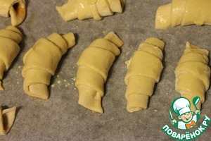 Рогалики выложить на противень, застеленный пергаментом и смазанный 1 ст. л. растительного масла. Верх рогаликов смазать молоком смешанным с желтком. Оставить на 20 минут.