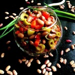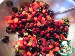 Из фасоли, маслин и каперсов слить жидкость. Маслины нарезать колечками, перец - кубиками, мяту нашинковать.
