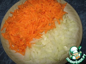 Лук нарезать мелким кубиком, морковь натереть на крупной терке