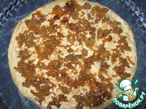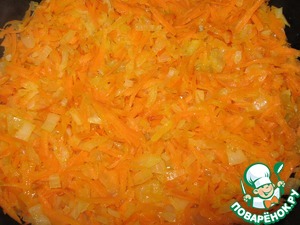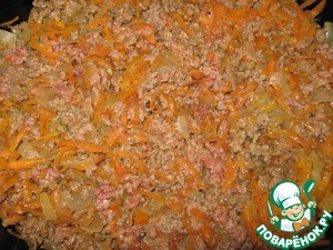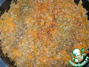 Подготовленный фарш добавить к обжаренному луку с морковью
