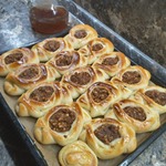 Сформовать все булочки, выложить на лист и дать расстояться минут 20. Я ставлю лист сразу в духовку на 75 градусов-минимальный у меня нагрев-и на нем булочки подходят. По истечению срока смазать булочки сладким чаем или яйцом с молоком, добавить нагрев до 200 градусов и выпекать до румяной корочки.