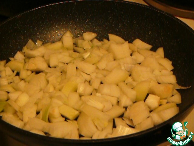 Репчатый лук мелко нарезать и обжарить на растительном масле до золотистого цвета. Готовый лук перекладываем в тарелку и даём ему остыть.