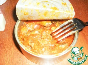 Для этого салата потребуется баночка рыбных консерв в томате. С банки немного жидкости слить и слегка размять вилкой рыбу. -