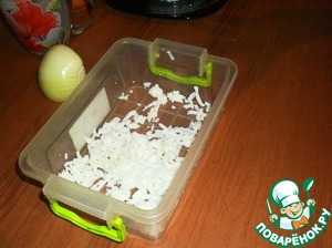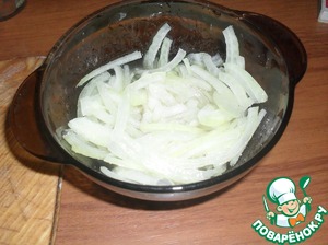 Лук порезать четверть кольцами и замариновать на 15 минут в смеси сахара и уксуса. Сахар плохо растворяется в уксусе, поэтому я, после маринования лук слегка ополоснула под струей воды. Чтобы смыть излишки сахара.